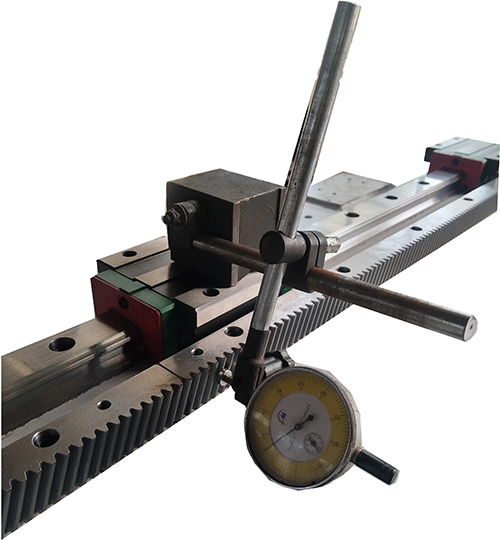 齿条安装时,均采用千分表检测齿条面与导轨的平行度,每台机床做好详细精度检验记录